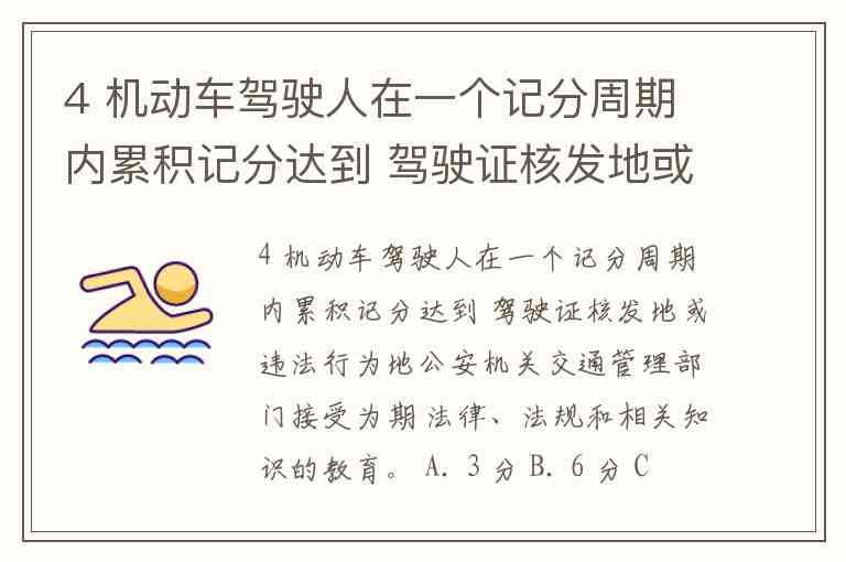 4 机动车驾驶人在一个记分周期内累积记分达到 驾驶证核发地或违法行为地公安机关交通管理部门接受为期 法律、法规和相关知识的教育。 A. 3 分 B. 6 分 C. 9 分 D. 12 分
