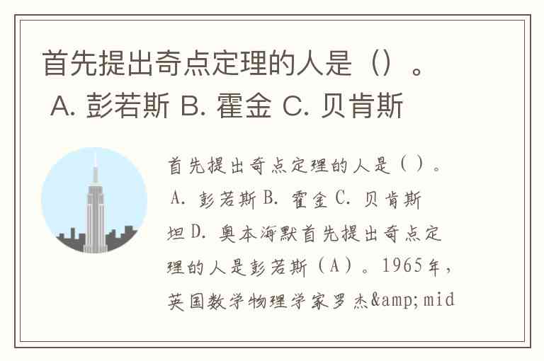 首先提出奇点定理的人是()。 A. 彭若斯 B. 霍金 C. 贝肯斯坦 D. 奥本海默