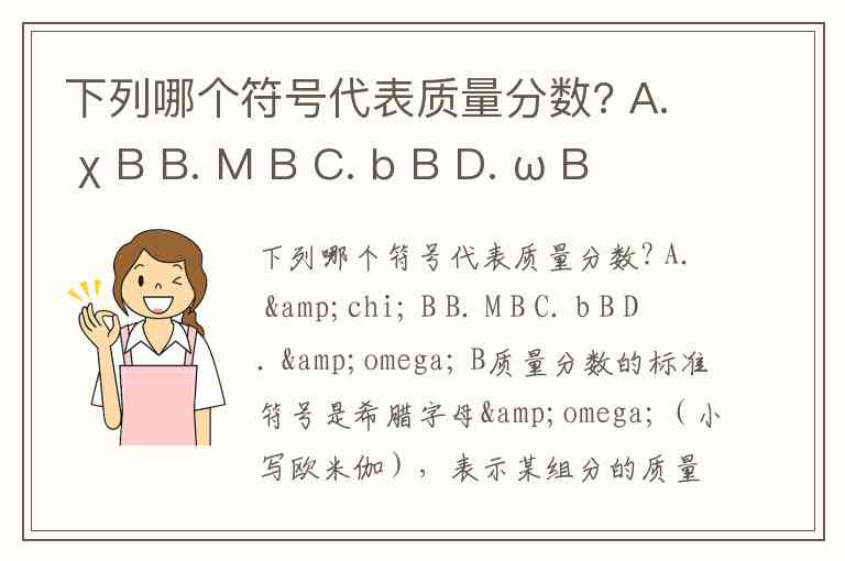 质量分数的标准符号是希腊字母ω(小写欧米伽),表示某组分的质量与混合物总质量之比。在选项中,正确答案为 D. ω_B,其中下标B代表混合物中的特定组分。