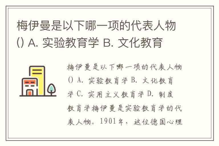 梅伊曼是以下哪一项的代表人物() A. 实验教育学 B. 文化教育学 C. 实用主义教育学 D. 制度教育学