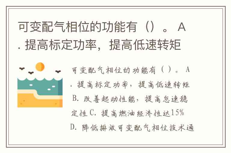 可变配气相位的功能有()。 A. 提高标定功率,提高低速转矩 B. 改善起动性能,提高怠速稳定性 C. 提高燃油经济性达15% D. 降低排放