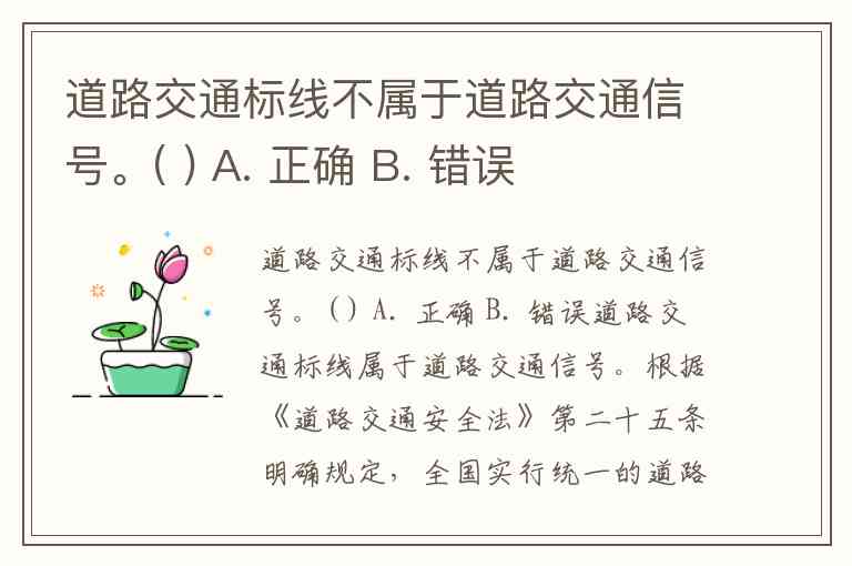 正确答案为B. 错误。理解这一分类有助于驾驶员全面遵守交通规则——在道路通行中,交通标线与信号灯、标志具有同等法律效力,忽视标线指示可能导致交通违法或事故风险。你是否曾注意到哪些特殊标线容易被误认或忽视?
