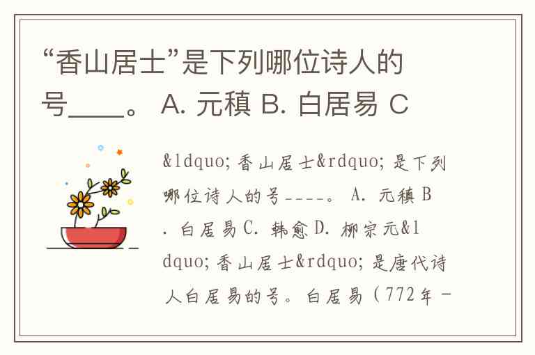 “香山居士”是下列哪位诗人的号____。 A. 元稹 B. 白居易 C. 韩愈 D. 柳宗元