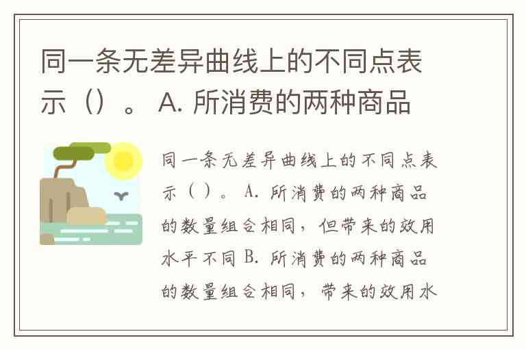 同一条无差异曲线上的不同点表示效用水平相同但商品组合比例不同的选择,对应选项 C。这一结论源于无差异曲线的核心定义:它是描述消费者在两种商品的不同数量组合中获得同等满足程度的轨迹。例如,消费者可能认为“2个苹果+3个香蕉”与“4个苹果+1个香蕉”带来相同效用,这两个组合会位于同一条曲线上,但商品数量比例显然不同。
