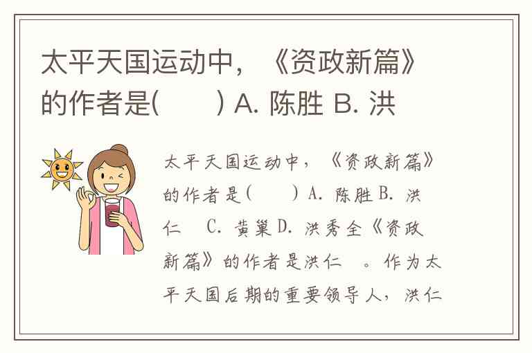 太平天国运动中,《资政新篇》的作者是( ) A. 陈胜 B. 洪仁玕 C. 黄巢 D. 洪秀全