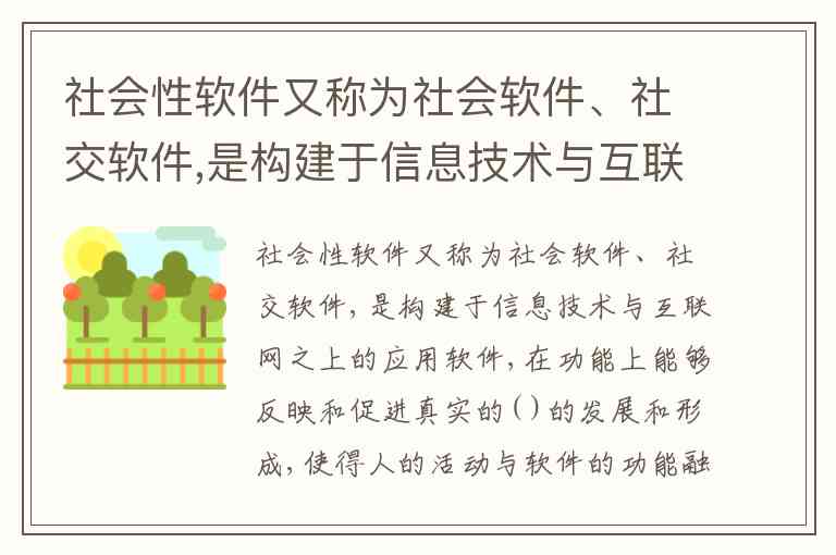 社会性软件的核心功能在于反映和促进真实的社会关系发展与形成,而非单纯的技术连接或虚拟互动。根据定义,这类软件通过沟通、分享、协作等活动,帮助个体、群体或组织维系和拓展亲缘、地域、协作等现实社会关系网络,最终实现“人的活动与软件功能融为一体”的效果。