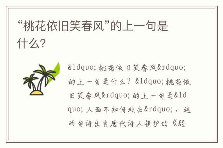 “桃花依旧笑春风”的上一句是“人面不知何处去”,这两句诗出自唐代诗人崔护的《题都城南庄》。全诗为:“去年今日此门中,人面桃花相映红。人面不知何处去,桃花依旧笑春风。”