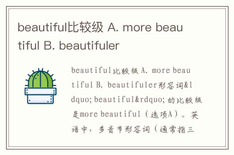 形容词“beautiful”的比较级是more beautiful(选项A)。英语中,多音节形容词(通常指三个或更多音节)的比较级一般通过在前面加“more”构成,而非加“-er”后缀。“beautiful”有三个音节(beau-ti-ful),符合这一规则。而“beautifuler”(选项B)是错误形式,因为双音节以上形容词很少用“-er”变比较级,强行添加会显得不自然且不符合语法规范。