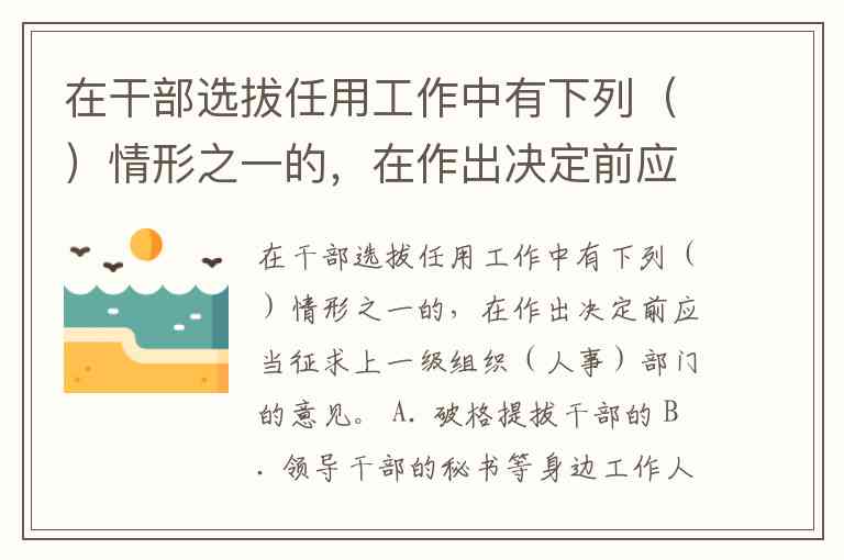 在干部选拔任用工作中有下列()情形之一的,在作出决定前应当征求上一级组织(人事)部门的意见。 A. 破格提拔干部的 B. 领导干部的秘书等身边工作人员提拔任用的 C. 干部达到任职或者退休年龄界限的,需要延迟免职(退休)的