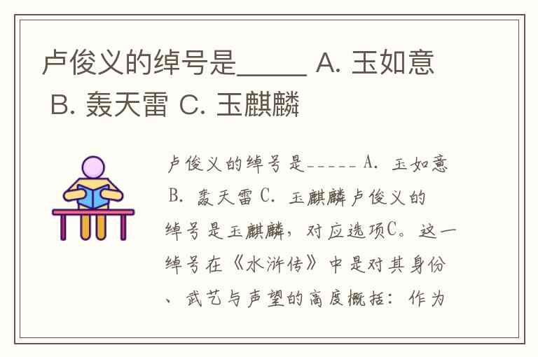 卢俊义的绰号是玉麒麟,对应选项C。这一绰号在《水浒传》中是对其身份、武艺与声望的高度概括:作为河北大名府的富商员外,他"家资巨富,社会地位崇高",同时以"棍棒天下无双"的武艺被誉为"河北三绝",在梁山一百单八将中排位第二,上应天罡星。"麒麟"象征人中领袖,而"玉"则呼应其"首富大善"的形象与人望,二者结合既体现他"生擒史文恭、轮战梁山将"的武力值,也暗示其"济困扶危"的品格。