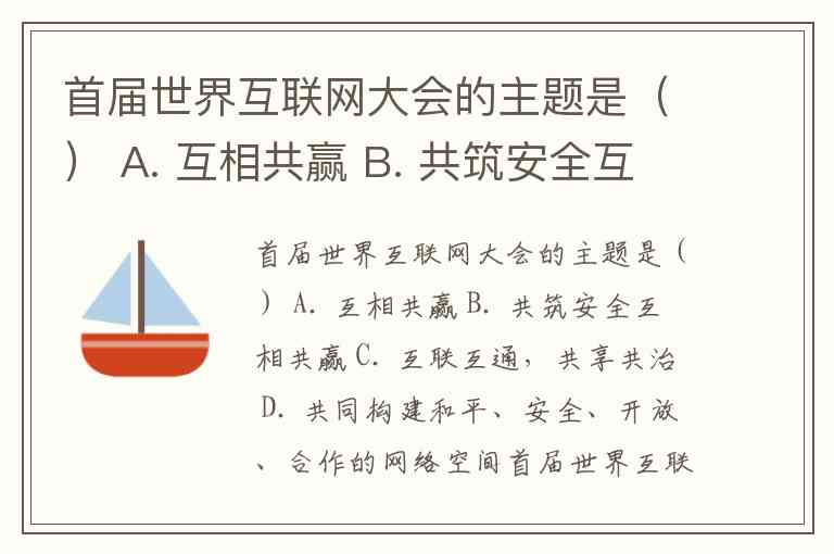 首届世界互联网大会的主题是() A. 互相共赢 B. 共筑安全互相共赢 C. 互联互通,共享共治 D. 共同构建和平、安全、开放、合作的网络空间