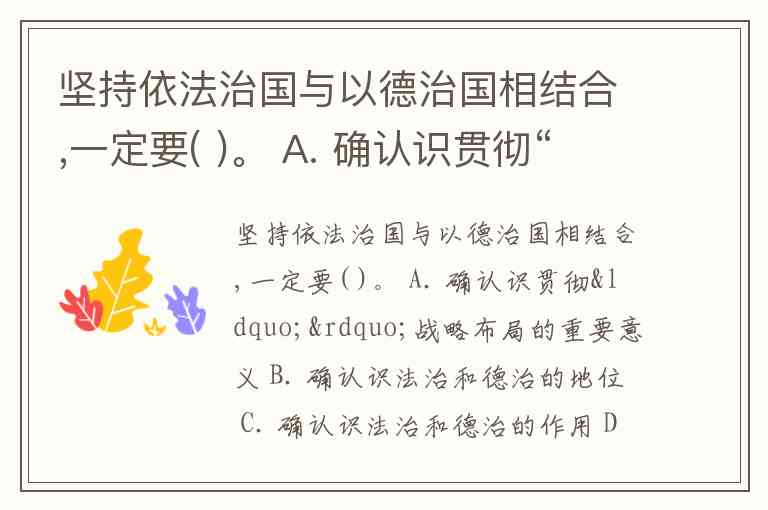 坚持依法治国与以德治国相结合,一定要( )。 A. 确认识贯彻“”战略布局的重要意义 B. 确认识法治和德治的地位 C. 确认识法治和德治的作用 D. 确认识法治和德治的实现途径 E. 动法治和德治的相互促进