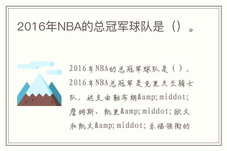 2016年NBA总冠军是克里夫兰骑士队。这支由勒布朗·詹姆斯、凯里·欧文和凯文·乐福领衔的球队,在总决赛中创造了NBA历史上最伟大的逆转之一——他们在1-3落后金州勇士队的绝境下连扳三局,最终以4-3的总比分夺魁,为克利夫兰带来了队史首座总冠军奖杯。