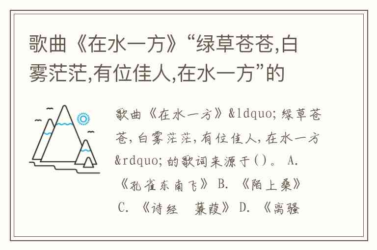 歌曲《在水一方》“绿草苍苍,白雾茫茫,有位佳人,在水一方”的歌词来源于( )。 A. 《孔雀东南飞》 B. 《陌上桑》 C. 《诗经▪蒹葭》 D. 《离骚》