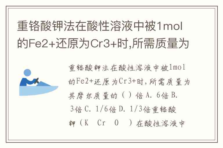 重铬酸钾法在酸性溶液中被1mol的Fe2+还原为Cr3+时,所需质量为其摩尔质量的()倍 A. 6倍 B. 3倍 C. 1/6倍 D. 1/3倍