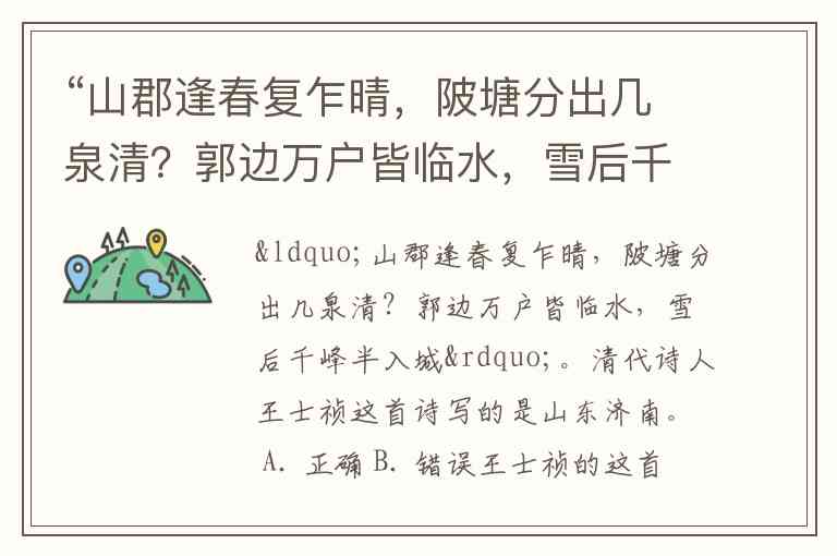 “山郡逢春复乍晴,陂塘分出几泉清?郭边万户皆临水,雪后千峰半入城”。清代诗人王士祯这首诗写的是山东济南。 A. 正确 B. 错误