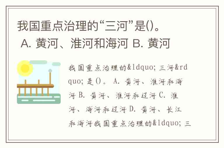 我国重点治理的“三河”是()。 A. 黄河、淮河和海河 B. 黄河、淮河和辽河 C. 淮河、海河和辽河 D. 黄河、长江和海河