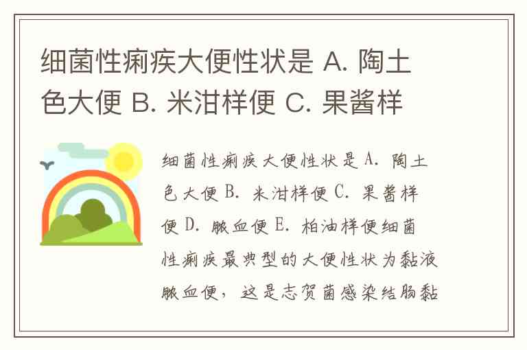 细菌性痢疾大便性状是 A. 陶土色大便 B. 米泔样便 C. 果酱样便 D. 脓血便 E. 柏油样便