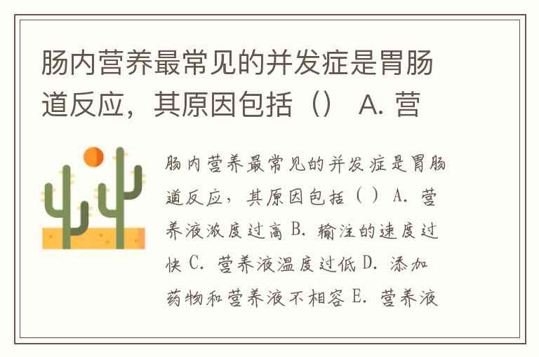 肠内营养最常见的并发症是胃肠道反应,其原因包括() A. 营养液浓度过高 B. 输注的速度过快 C. 营养液温度过低 D. 添加药物和营养液不相容 E. 营养液受到污染
