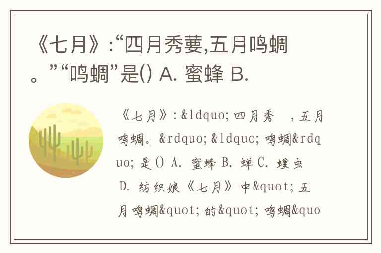 《七月》:“四月秀葽,五月鸣蜩。”“鸣蜩”是() A. 蜜蜂 B. 蝉 C. 蝗虫 D. 纺织娘