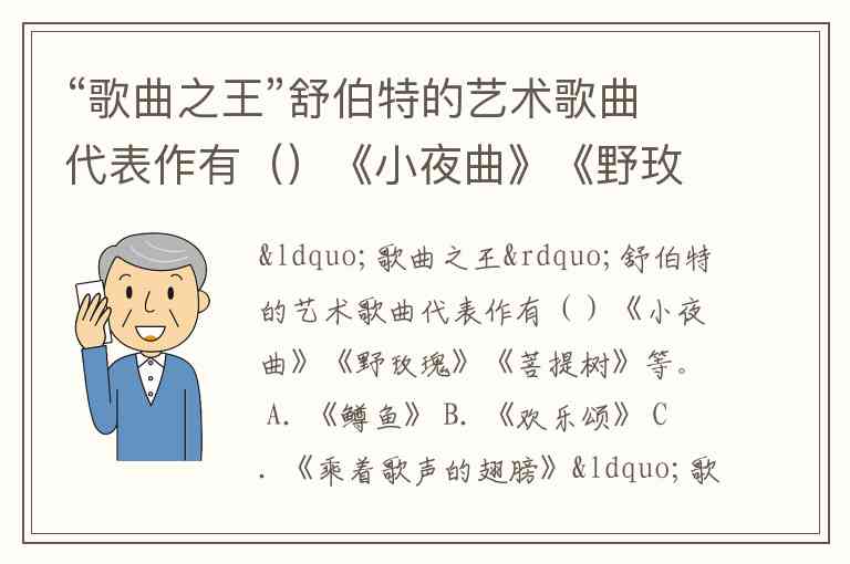 “歌曲之王”舒伯特的艺术歌曲代表作有 A.《鳟鱼》《小夜曲》《野玫瑰》《菩提树》等。