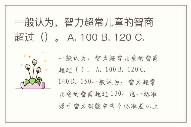 一般认为,智力超常儿童的智商超过()。 A. 100 B. 120 C. 140 D. 150