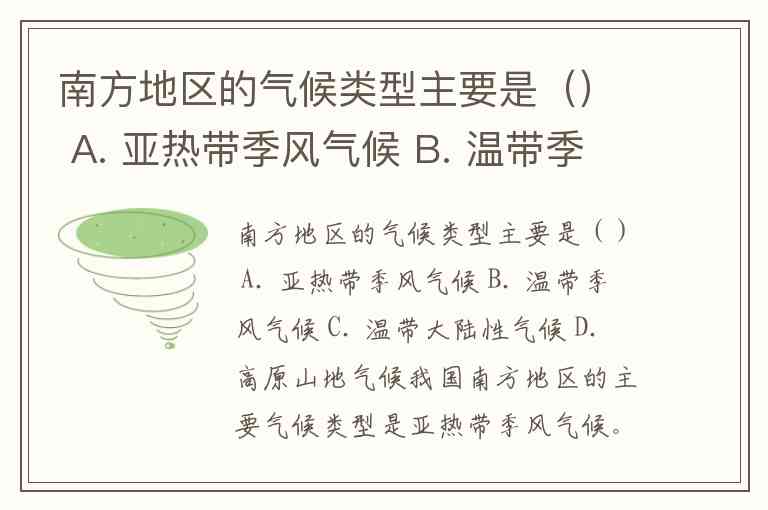 南方地区的气候类型主要是() A. 亚热带季风气候 B. 温带季风气候 C. 温带大陆性气候 D. 高原山地气候