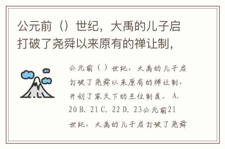 公元前()世纪,大禹的儿子启打破了尧舜以来原有的禅让制,开创了家天下的王位制度。 A. 20 B. 21 C. 22 D. 23