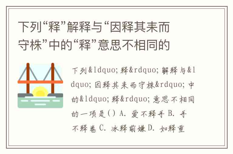 “因释其耒而守株”中的“释”意为“放下”,指农夫放下农具守着树桩。选项中“冰释前嫌”的“释”意思不同,它表示“消除”,指化解之前的矛盾。