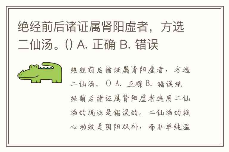 绝经前后诸证属肾阳虚者,方选二仙汤。() A. 正确 B. 错误