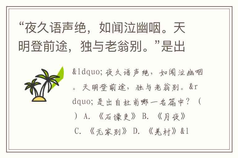 “夜久语声绝,如闻泣幽咽。天明登前途,独与老翁别。”是出自杜甫哪一名篇中?() A. 《石壕吏》 B. 《月夜》 C. 《无家别》 D. 《羌村》