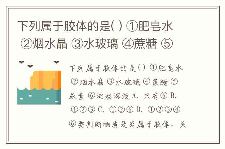 下列属于胶体的是( ) ①肥皂水 ②烟水晶 ③水玻璃 ④蔗糖 ⑤尿素 ⑥淀粉溶液 A. 只有⑥ B. ①②③ C. ①②⑥ D. ①②③④⑥