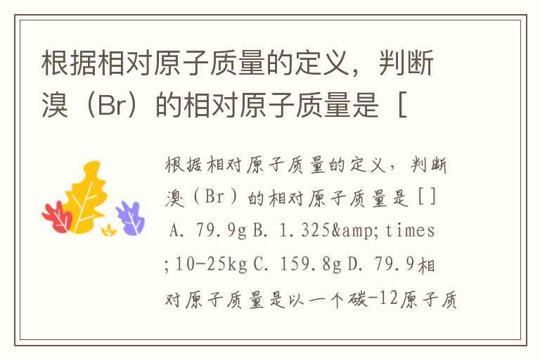 根据相对原子质量的定义,判断溴(Br)的相对原子质量是 [ ] A. 79.9g B. 1.325×10-25kg C. 159.8g D. 79.9