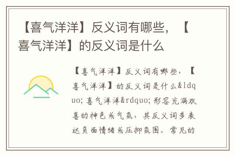 “喜气洋洋”形容充满欢喜的神色或气氛,其反义词多表达负面情绪或压抑氛围。常见的反义词包括:垂头丧气(形容情绪低落、萎靡不振)、愁眉苦脸(因忧愁而眉头紧锁)、哀声叹气(因悲伤或不如意而叹息)、忧心忡忡(形容心事重重、忧虑不安)、悲愤填膺(悲痛与愤怒充满胸膛)、黯然神伤(情绪低落,心神忧伤)。