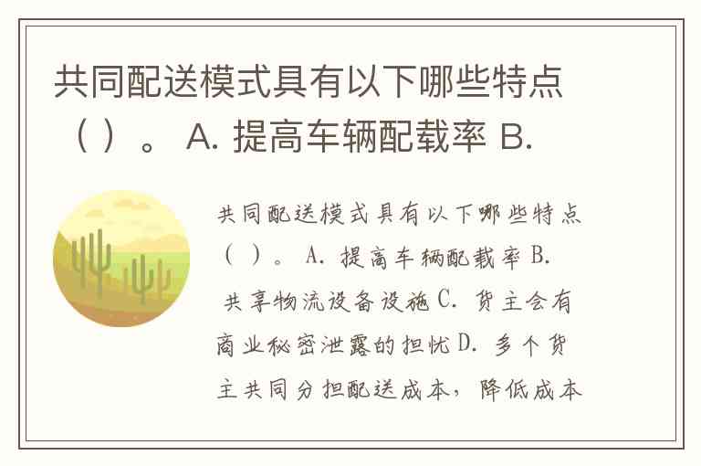 共同配送模式通过整合多方资源实现降本增效,其核心特点包括资源共享、成本分摊和效率提升,同时也存在协调复杂性和商业秘密保护等挑战。以下选项均符合共同配送的典型特征:
