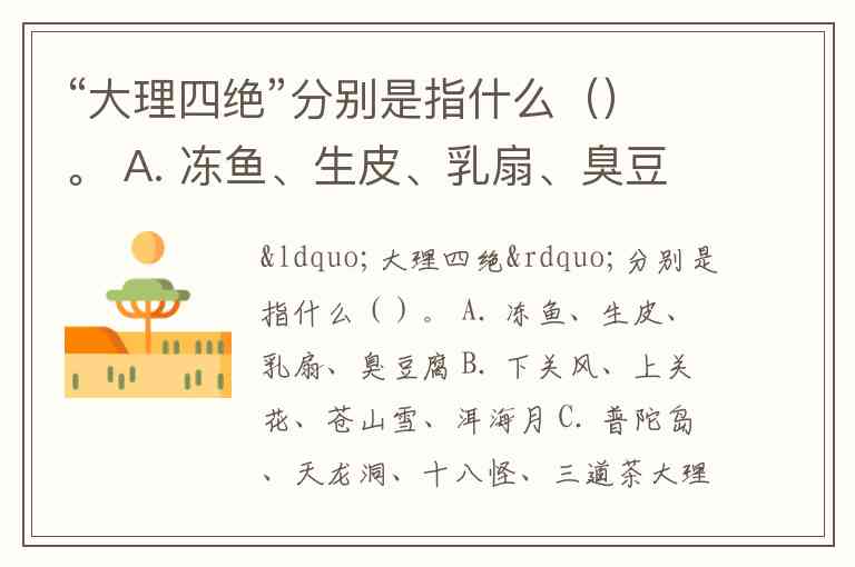 “大理四绝”分别是指什么()。 A. 冻鱼、生皮、乳扇、臭豆腐 B. 下关风、上关花、苍山雪、洱海月 C. 普陀岛、天龙洞、十八怪、三道茶