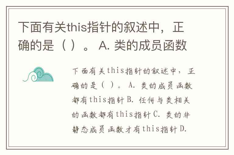 下面有关this指针的叙述中,正确的是( )。 A. 类的成员函数都有this指针 B. 任何与类相关的函数都有this指针 C. 类的非静态成员函数才有this指针 D. 类的友元函数都有this指针