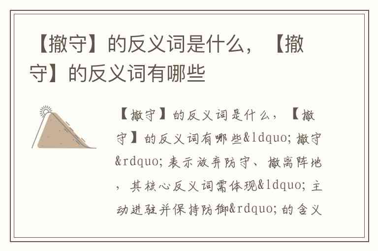 “撤守”表示放弃防守、撤离阵地,其核心反义词需体现“主动进驻并保持防御”的含义。根据语义关联和军事术语特性,“布防”“设防” 是最精准的反义词,二者均强调预先部署防御力量以守卫特定区域。