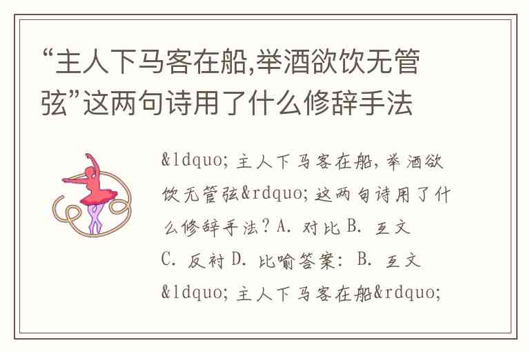 “主人下马客在船,举酒欲饮无管弦”这两句诗用了什么修辞手法? A. 对比 B. 互文 C. 反衬 D. 比喻