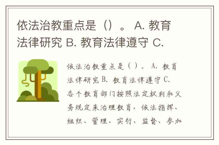 依法治教重点是()。 A. 教育法律研究 B. 教育法律遵守 C. 各个教育部门按照法定权利和义务规定来治理教育,依法指挥、组织、管理、实行、监督、参加教育活动 D. 教育立法