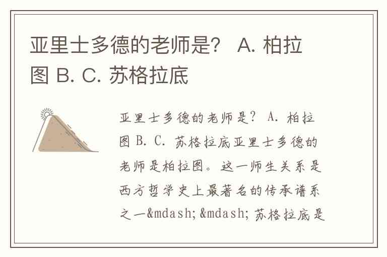 亚里士多德的老师是? A. 柏拉图 B. C. 苏格拉底
