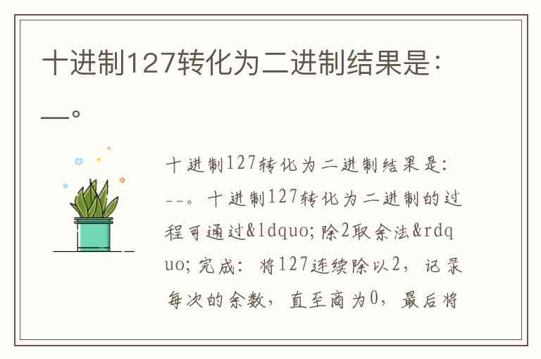十进制127转化为二进制的过程可通过“除2取余法”完成:将127连续除以2,记录每次的余数,直至商为0,最后将余数倒序排列。具体计算如下: