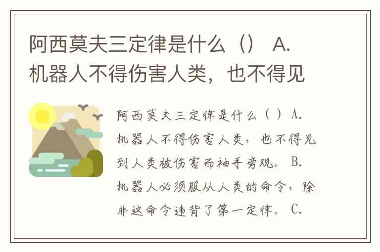 阿西莫夫三定律是什么() A. 机器人不得伤害人类,也不得见到人类被伤害而袖手旁观。 B. 机器人必须服从人类的命令,除非这命令违背了第一定律。 C. 在不违背第一、第二定律的前提下,机器人应保护自己。 D. 机器人必须保护人类的整体利益不受伤害。