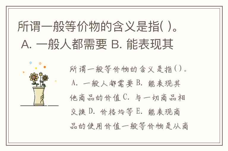 所谓一般等价物的含义是指( )。 A. 一般人都需要 B. 能表现其他商品的价值 C. 与一切商品相交换 D. 价格均等 E. 能表现商品的使用价值