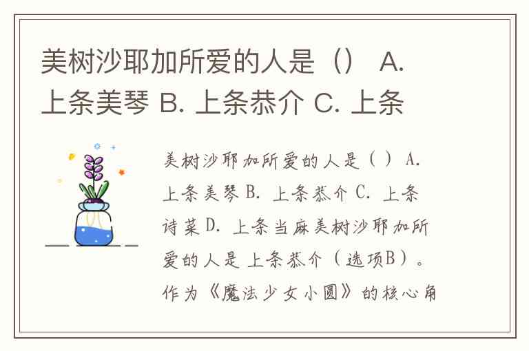 值得注意的是,其他选项均来自不同作品:上条当麻是《魔法禁书目录》主角,上条美琴是其衍生角色,上条诗菜则是当麻的母亲。这些"上条"角色与《魔法少女小圆》无关,进一步印证答案为B. 上条恭介。这段单向付出的悲剧,恰如人鱼公主的童话隐喻,成为沙耶加角色魅力中最令人唏嘘的部分。