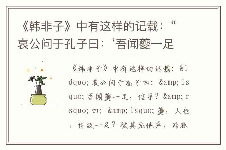 《韩非子》中有这样的记载:“哀公问于孔子曰:‘吾闻夔一足,信乎?’曰:‘夔,人也,何故一足?彼其无他异,而独通于声。尧曰:“夔一而足矣。”使为乐正。故君子曰:“虁有一足。”非一足也。’”根据这段话可以知道“夔一足”的意思应该是() A. 夔有一只脚 B. 夔有一子 C. 夔有一个就够了 D. 夔是一只脚