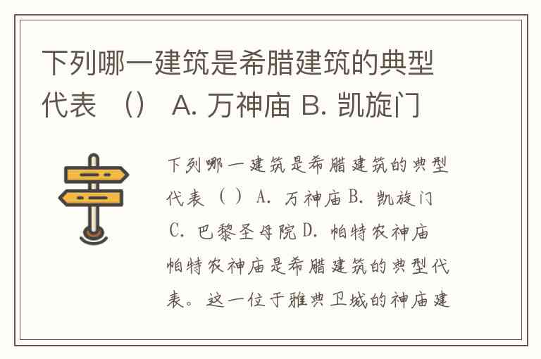 下列哪一建筑是希腊建筑的典型代表 () A. 万神庙 B. 凯旋门 C. 巴黎圣母院 D. 帕特农神庙