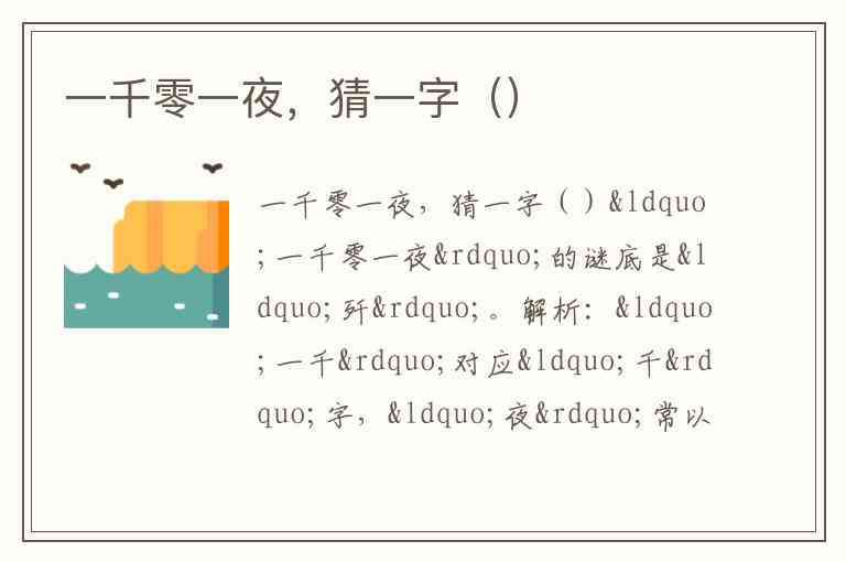 “一千零一夜”的谜底是“歼”。解析:“一千”对应“千”字,“夜”常以“夕”为代表(因“夕”本义指夜晚),“千”与“夕”组合即构成“歼”字。