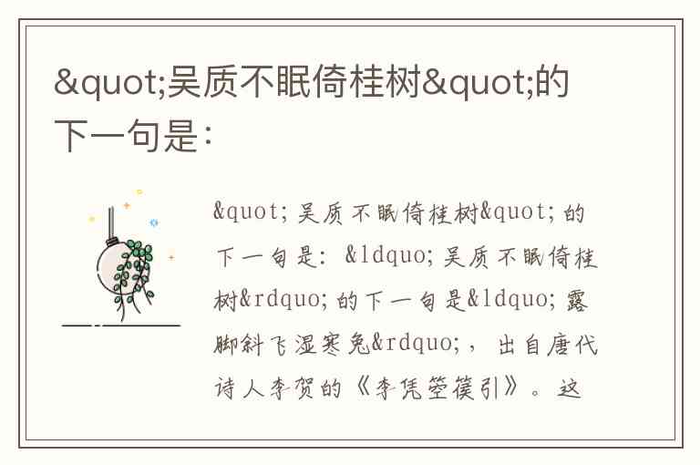 “吴质不眠倚桂树”的下一句是“露脚斜飞湿寒兔”,出自唐代诗人李贺的《李凭箜篌引》。这句诗以神话场景收尾,描绘月宫中吴刚(吴质)因箜篌乐声而忘却伐桂,倚树聆听,清冷的露珠斜飞而下沾湿月兔的画面。全诗通过“昆山玉碎凤凰叫”“石破天惊逗秋雨”等奇绝意象,将抽象的乐声转化为可见可感的视觉奇观,展现了李凭演奏箜篌的震撼效果。
