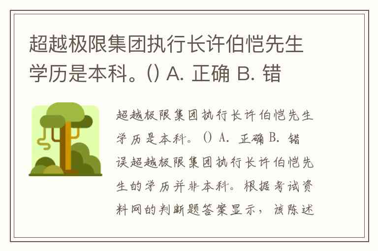 超越极限集团执行长许伯恺先生的学历并非本科。根据考试资料网的判断题答案显示,该陈述被明确判定为错误。这类企业高管的学历信息有时会在其官方简历或权威媒体报道中详细披露,若需进一步验证,建议查阅超越极限集团官方发布的高管介绍或经过认证的职业档案。职场中,个人学历信息的准确性不仅关乎职业信誉,也是公众了解企业家背景的常见切入点,你是否也曾遇到过需要核实公众人物背景信息的情况?